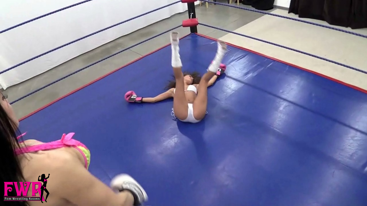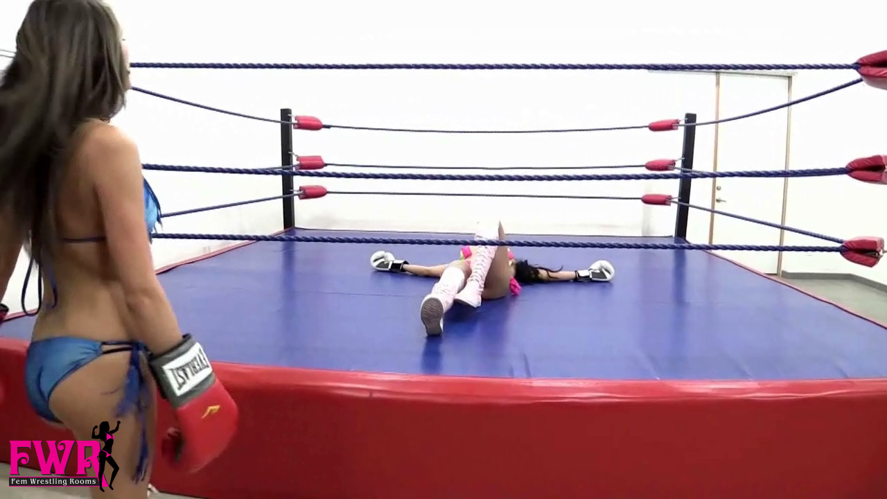 (Filmed 4/18/2016) This great custom video begins with Antoinette in her bedroom getting into bed. She has a boxing match versus Peyton tomorrow and is so confident that she talks about skipping her training … sure that she’ll be able to crush the skinny brunette with ease. As Antoinette drifts off to sleep she begins to dream of her dominance over Peyton. Antoinette dreams about the complete one sided boxing destruction, as poor Peyton is punched all over the ring (complete with the "Patented Fem Wrestling Rooms Speedbag Facial") and quickly knocks her out cold with an uppercut! After Antoinette’s victory pose, we fade out of her dream and back to reality, as Antoinette wakes up, overflowing with even more confidence now after her dream of complete domination. We fade into the ring for the actual match, where Peyton is warming up. Antoinette walks in, filled with confidence, as she claims that this will be a quick match. Peyton isn't concerned and uses her speed to duck two of the larger beauty's hooks, then nails Antoinette with an uppercut! Antoinette gets angry and shoves Peyton into a corner for a HARD jab to the face … but the tiny brunette ducks and Antoinette smashes her fist into the hard turnbuckle! We soon find out that Peyton is way too fast for Antoinette and in no time Antoinette is dazed and at Peyton's mercy. Peyton traps the dazed amazon in many compromising positions around the ring, dominating her helpless foe with tons of punches to the face and body as well as multiple patented Fem Wrestling Rooms Speed Bag Facials. Antoinette even finds herself trapped in the ropes TWO times to get PLOWED with punches from the cute and giggling Peyton! The end of Antoinette’s destruction finally comes after Peyton delivers a kiss on the cheek and a crushing uppercut to the jaw, knocking Antoinette out cold. Peyton strikes her victory poses over the sleeping amazon then skips back to the dressing room. Antoinette comes to after Peyton has left, really punch drunk, and groggily admits that she probably shouldn’t have skipped her training! Her eyes cross and she passes back out. You'll LOVE this fun custom video!
