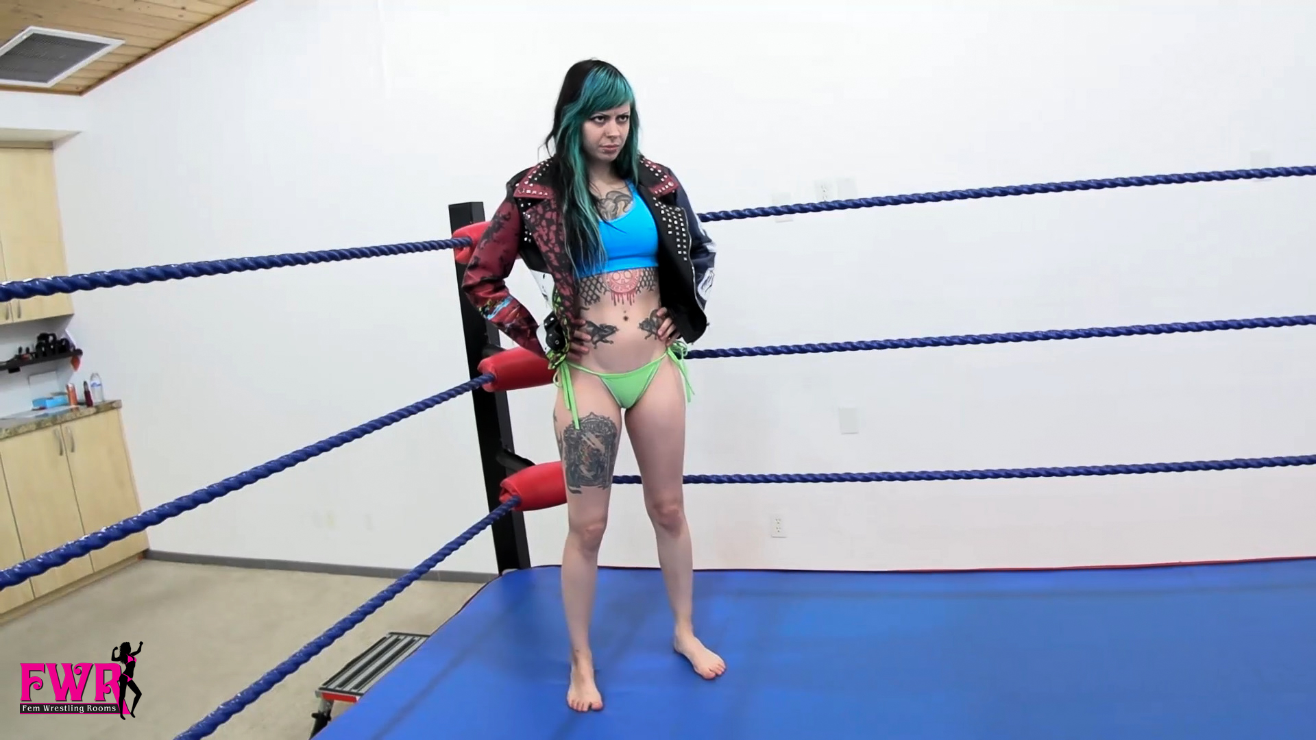 We open with an angry Larz wearing her ring gear and favorite ring jacket. She yells at the producer (cameraman) that the match coming up is NOT the one she asked for. She expected a title match against Peyton but feels that she’s being treated unfairly. She’s told that if she beats Lo, she’ll get to a title match sooner. We fade to the ring and the match begins. Lo is obviously stronger than Larz and dominates her in the beginning, but Larz manages to use her speed to gain some momentum. The action includes incredible fast-paced action that goes back and forth with Lo submitting the first round after Larz’s Fever Dream hold and Larz submitting the second round from a corner foot choke. In the final round, Lo wears Larz down with a body slam, bow and arrow, and a body stretching sidewinder. Lo finally bends Larz over her knee to apply intense pressure, but Larz knows she’ll lose the match if she submits. Suddenly, a white towel is thrown in from ringside, ending the match and giving Lo the victory. Who threw in the towel? None other than Peyton who decided to save Larz from injury … so Larz can fight HER in the next match (coming soon).