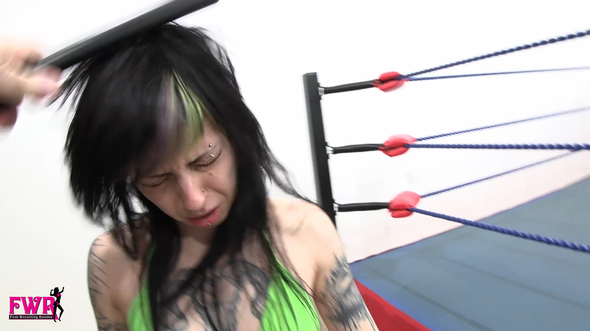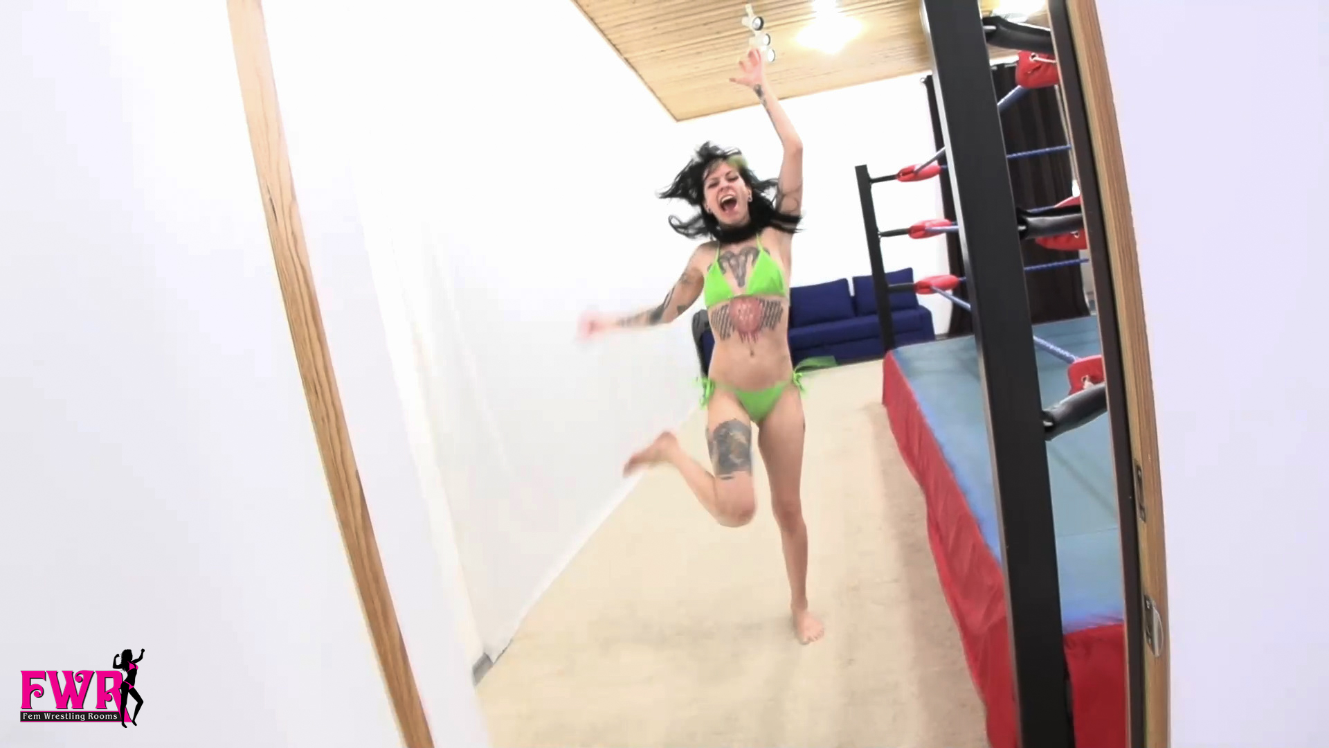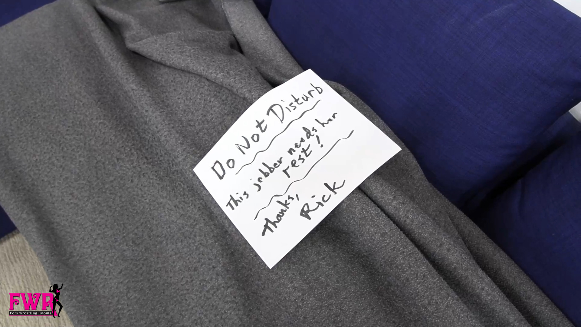 The boss comes into the studio to do some cleaning and finds Larz knocked out on the couch. He wakes her and tells the groggy girl that since she’s been losing so many matches lately, the other girls are beginning to call her the new FWR jobber. An upset Larz confronts him and decides to prove herself … by fighting him! What follows is nearly 30 minutes of Larz attacking and quickly getting knocked out. Each time she attacks, she calls out that she wants a rematch. Poor Larz is knocked out with punches, turnbuckle head smashes, an iron claw, sleepy rag ko, a running “REMATCH!!!” into the dressing room door, a hand-vacuum ko, a tazer, barefoot pressure point, a nerve pinch over the ring ropes, self-ko with a broom, a thigh nerve pinch while she applies a reverse head scissor, a blackjack, a frying pan to the face, and a full-body pressure point ko. There’s plenty of pins, crossed eyes, silly over-the-top reactions, limp play, eye checks, and twitching throughout the video. In the end, Larz is covered by a blanket on the couch to sleep it off, as the boss writes a do-not-disturb note on her. We’re sure you’ll love this amazing video!