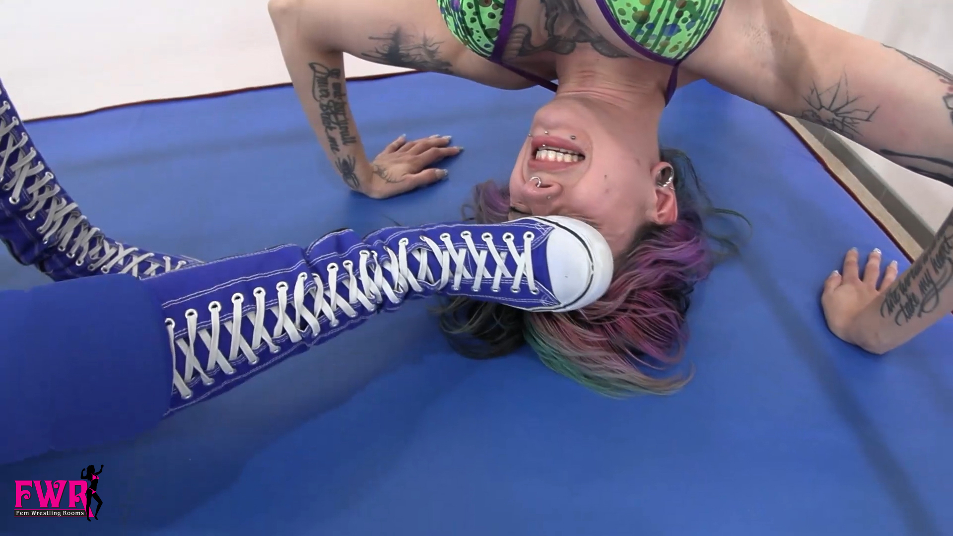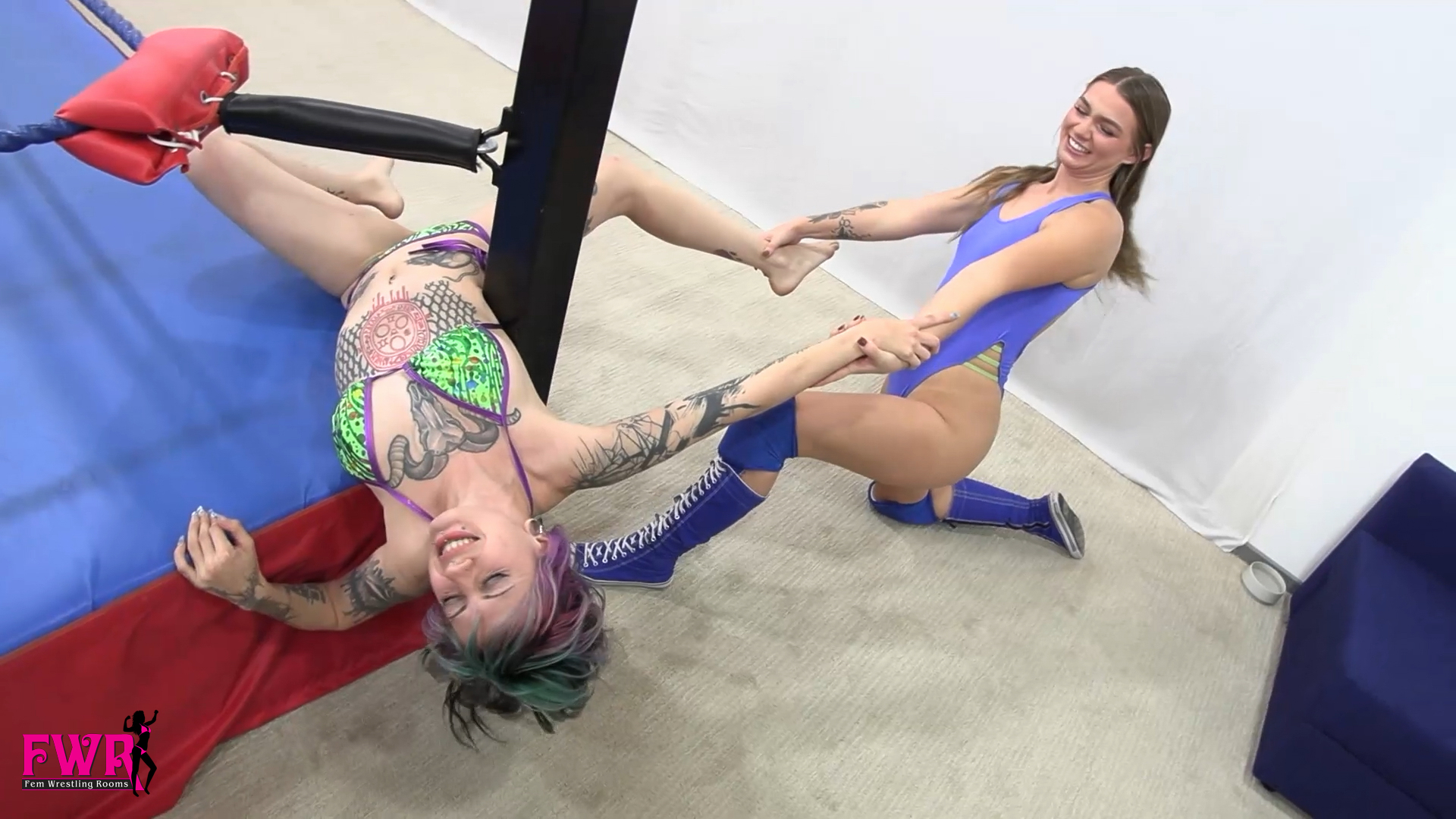 Larz joins Lauren in the ring and learns that Lauren wants to demonstrate some of her wrestling knowledge in an instructional video. She suddenly kicks Larz in the belly then drops her with a stunner, then begins her video to the fans. She begins by demonstrating how to use the ring to destroy your opponent then works the stunned Larz over in the corners, on the mat, and on the ropes. She follows by bending the groggy Larz’s body and legs around the steel ring post as the beauty screams in pain. The next demonstration is a power move as Lauren hoists Larz up and into a great torture rack. Lauren finishes her video by wrapping Larz’s arms up in the ropes and slowly knocks her out with a great sleeper hold. Poor Larz hangs unconscious in the ropes as Lauren thanks her for being such a great training dummy. Enjoy!