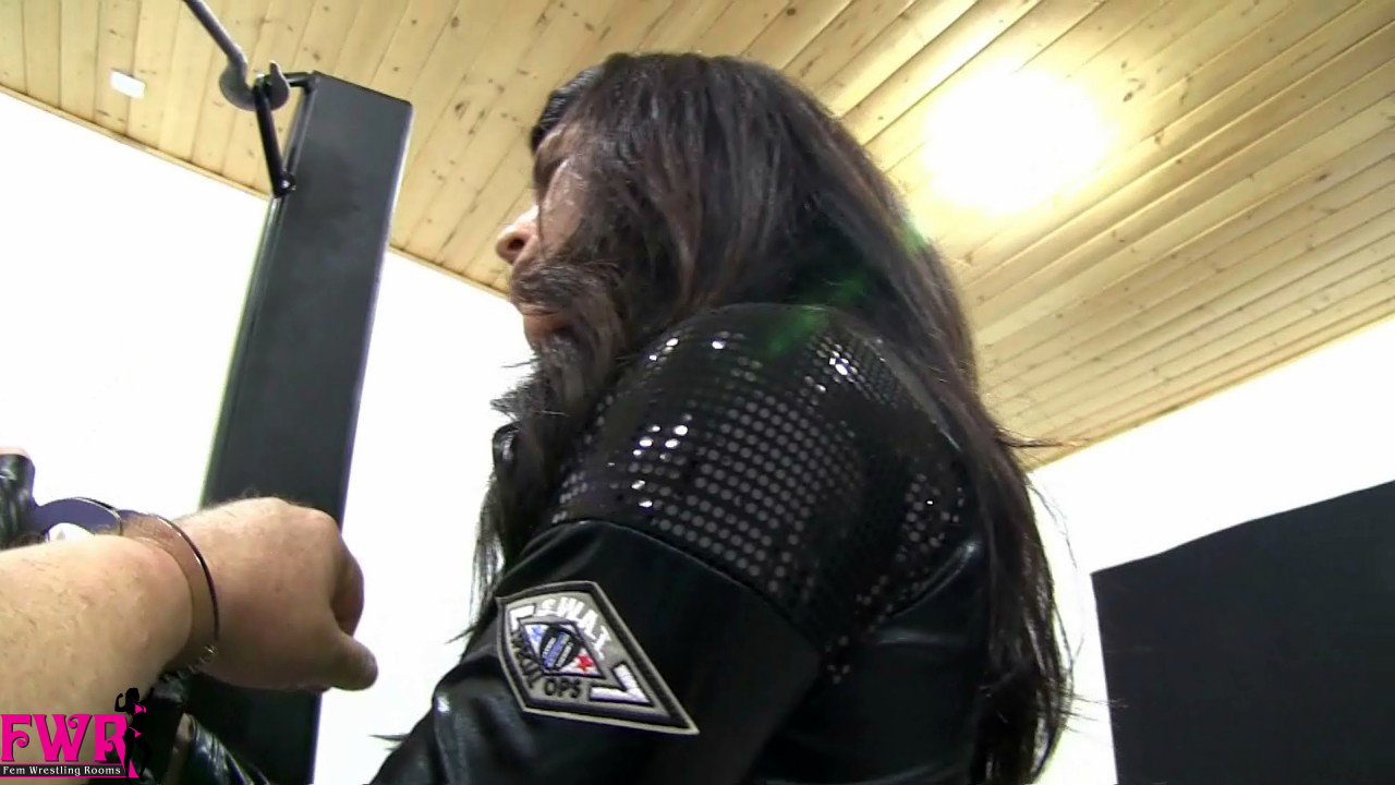 (Filmed 11/15/2014) It seems as though you had a little fun last night! You went out drinking, got into a fight, hurt the HOT bartender's friend, and left a crappy tip! Well, it seems that the hot bartender is also a cop known as LeAnn and she's come looking for you! Dressed in a skin tight black vinyl bodysuit, LeAnn comes to your home then proceeds to beat the living daylights out of you before she takes you in. The lovely dark haired woman punches you, kicks you, chokes you with her boots, stomps you, knees you, and even gives you a few low blows in the process. The beating goes from your living room to your bedroom until she drags you out to the studio where there's more room to destroy you! In the end, you find yourself handcuffed to the ring post as the sexy vixen punches you a few more times, then leaves (in slow motion, of course, lol) to call her boys in to arrest you. This should be fun!!
