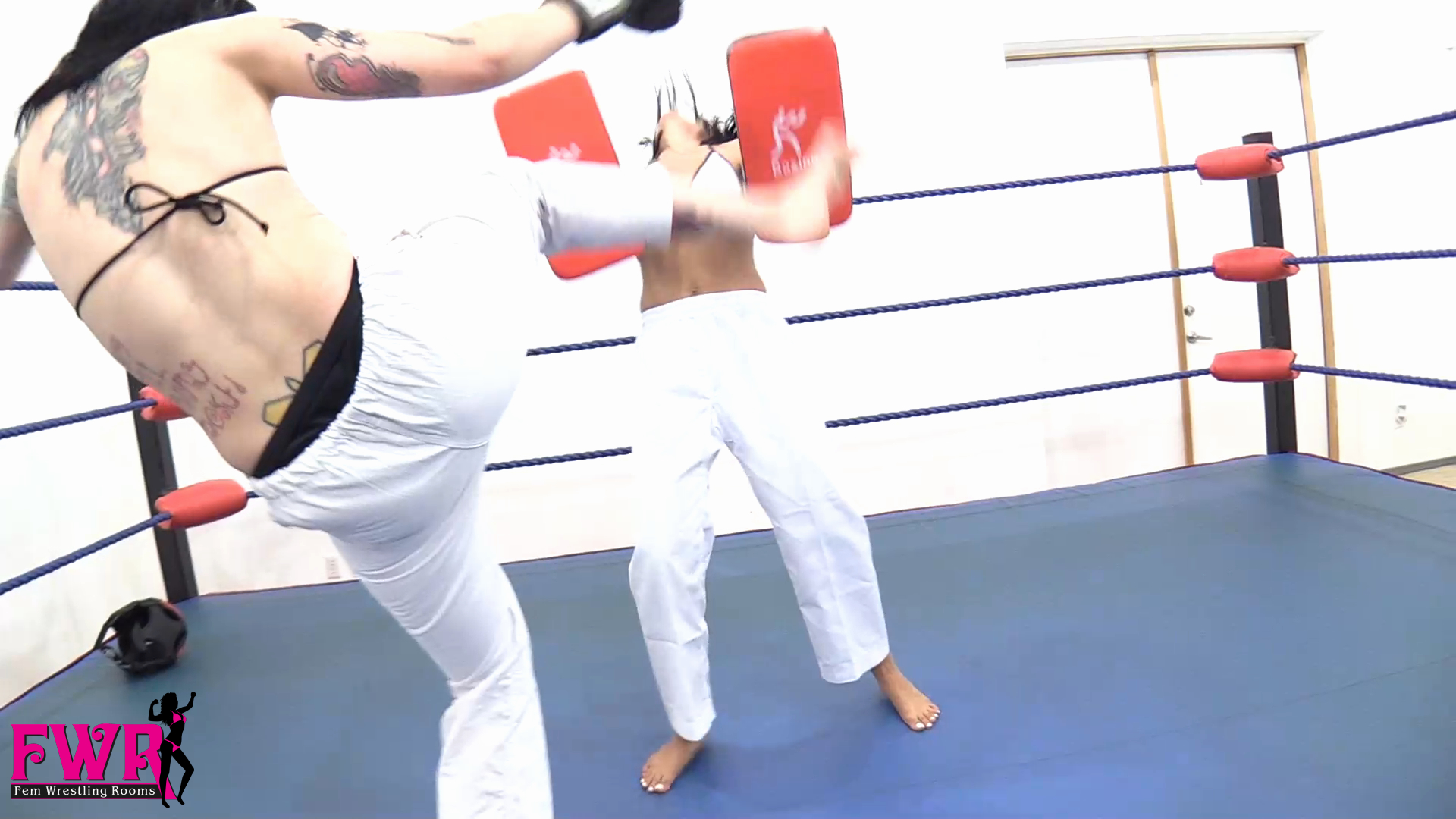 This specialty custom video begins with Larz warming up in the ring. She needs to practice her Muay Thai punches, kicks, and knee strikes so she recruited Mackenzi to hold the practice pads for her. The side door opens and in enters Mackenzi wearing a comical looking boxing headgear and carrying huge pads. Not knowing what to do and looking VERY nervous, Mackenzi needs Larz to show her how to hold the pads. When she’s ready, Larz demonstrates some simple kicks, knees, and punches to help Mackenzi relax. Then the fun begins! Larz throws harder blows and Mackenzi squeals and runs around the ring trying to avoid a frustrated Larz. It appears that Larz is concerned about Mackenzi and gives her a hug. She tells Mackenzi that she’ll go easy and convinces her to remove the headgear. More practice happens with Larz inevitable throwing harder blows as Mackenzi runs like crazy around the ring to avoid the crazy Muay Thai girl! In the end, Larz kicks Mackenzi square in the face then pretends to console her only to reveal that this was her plan all along. Larz leaves Mackenzi crying in the ring. Fade out!