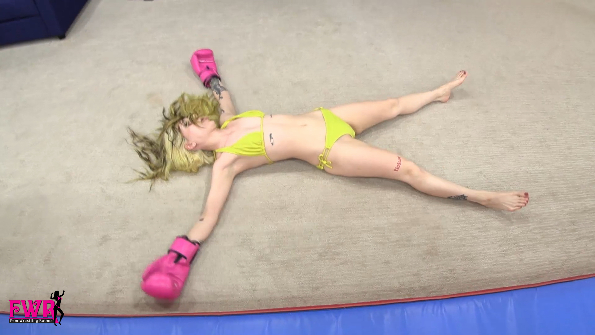 As your humble producer is cleaning up the studio, Persephone bursts in wearing boxing gloves. She’s angry that after she was knocked silly by Peyton, he continued to knock her out. What she forgot was that she was so groggy that she kept attacking him, forcing him to defend himself (see “Persephone’s Dizzy Battle”). She challenges him to a boxing match and he reluctantly accepts … and easily punches her into a dizzy/dazed mess. What follows is another long series of knockouts, ending with Persephone in a twitching state. You’ll enjoy more punchouts, nerve pinches, sleepy spray, and tons of crossed eyes, tongue out, and silly expressions each time she’s knocked out. The fun continues in the house where the dizzy Persephone keeps trying to pick a fight only to experience more creative knockouts: a smack on the head with a magazine, a foot pressure point, a blackjack, a tazer, a frying pan, and a brick. And you’ll especially love the silliest segments where Persephone, in a very groggy state, begins to fight the refrigerator only to get the door smashed into her head. Or when Persephone uses the weight machine to pump up for her match then self-punches herself. And especially when she appears in front of you on the treadmill as you’re working out (you’ll love this ko!). Enjoy this epic video!