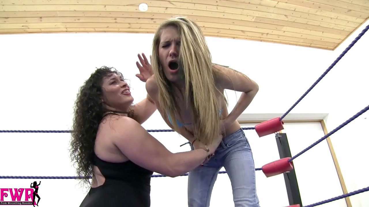 (Filmed 1/27/2015) Peyton shows up to the ring wearing her low rise jeans and crop top. She's there to talk about getting an advance payment since she needs money bad. The boss tells her that it can't be done and she has to actually wrestle someone. She tells him that he hasn’t matched her with someone in a while and she’s tired of waiting. The boss explains that she didn’t do so well the last time she wrestled with Mystique so he's had a hard time matching her up with someone who she’ll have a chance with. Suddenly Mystique steps into the ring because she's overheard the whole conversation. Mystique steps up to Peyton and starts to rub the young girl's belly, saying that she would love to wrestle her again because she loved punching her in the belly last time. Peyton reluctantly agrees to the match and the girls head to their corners. What happens next is a total domination of poor Peyton's little belly! The tough pro wrestler also throws in a nasty hair stand, bow and arrow, ceiling hold, and dragon sleeper. Peyton gets knocked out several times, screaming in pain from the punishment! Mystique finally finishes the girl off with a POWERFUL long held punch to her belly and strips the little girl out of her clothes to reveal her bikini. Not quite satisfied, Mystique does an amazing dead lift that has Peyton hanging high in the air, only to be dropped down into a nasty over the knee backbreaker that knocks her out for good!