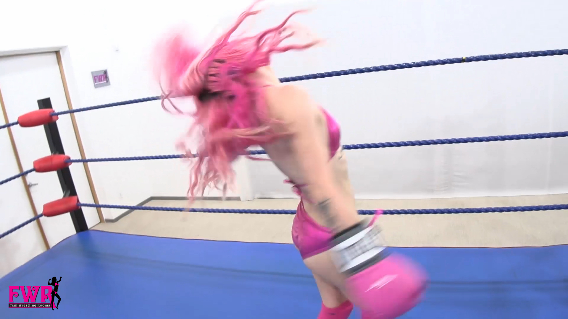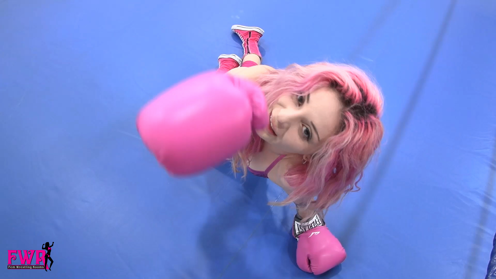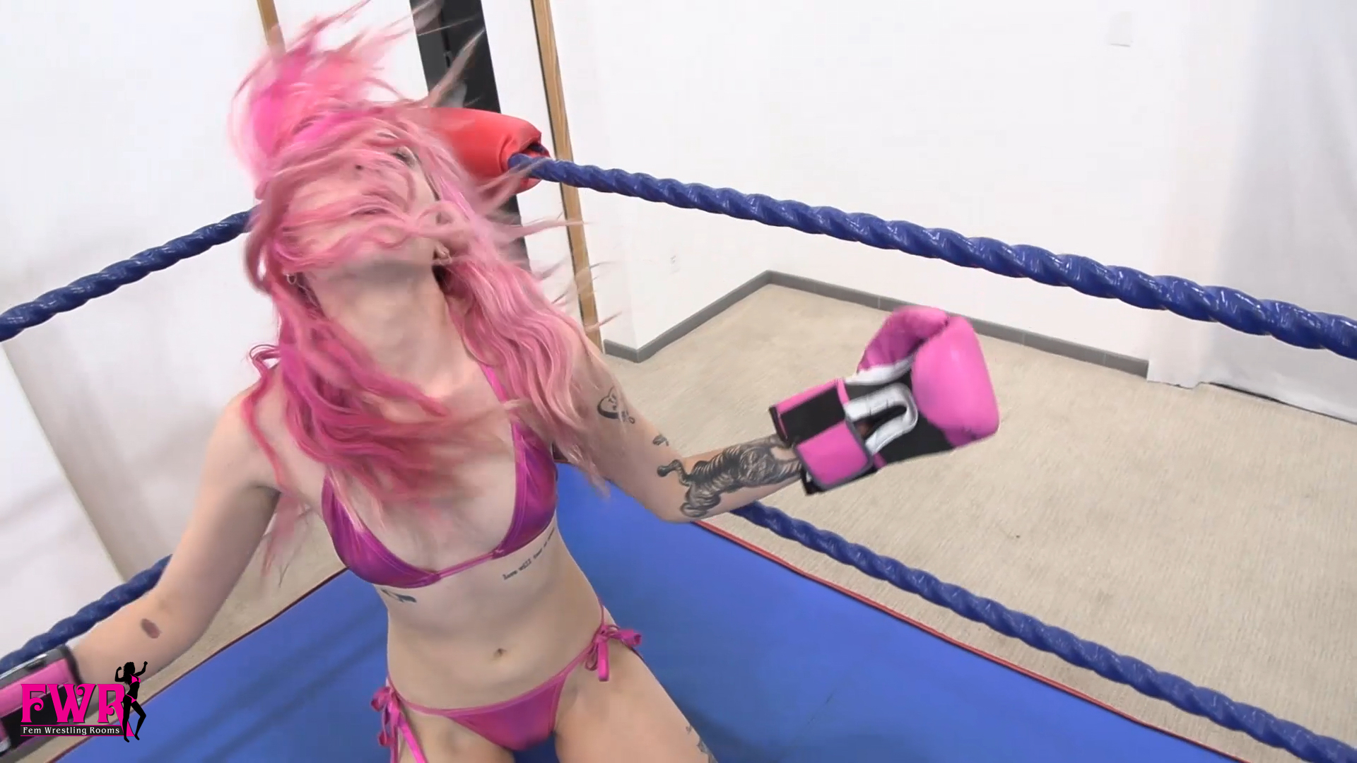 Persephone has been given the chance to take on the women's boxing champion. Dressed in a cute pink bikini with matching gloves and boots, Persephone enters the ring to find some guy (YOU) there. She immediately starts talking trash to you, asking why you’re here, talking about how this is a women's championship and so on. Annoyed that you don’t seem to want to leave she decides to punch you in the face. Unfazed, you punch her so hard it drops the pink-clad beauty. Persephone is stunned by the punch but is able to shake it off and get back to her feet. Even more pissed, Persephone continues fighting and is hit with another punch that drops her again. This time Persephone can't just shake it off as quickly and begins a long sequence of her journey into being a groggy, dazed, dizzy, twitching mess. Filled with lots of silly reactions and scenes, Persephone tries her dizzy best to win … but only ends up knocked out on the mat. You’ll love this fun video!