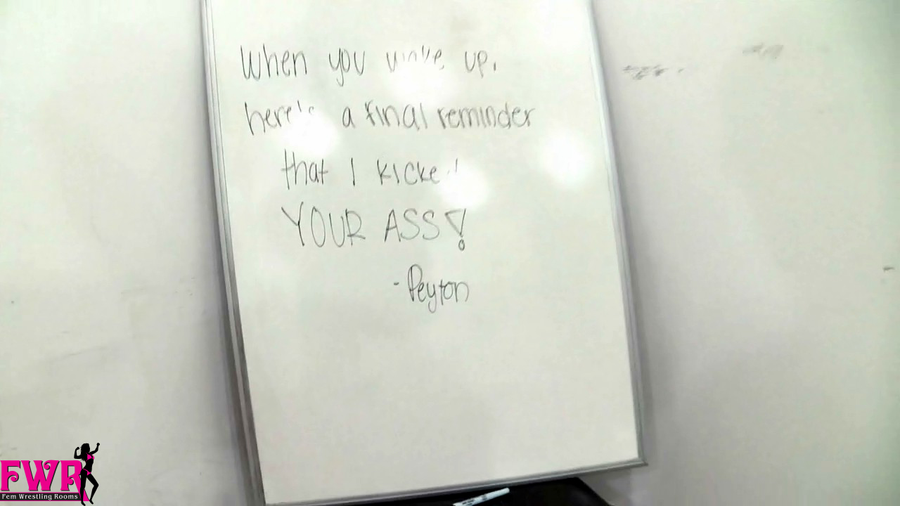(Filmed 6/18/2015) We join Peyton in the dressing room where she informs us that she's about to have her first mixed boxing match! And to make sure she wins, she's loaded her boxing glove with some plaster! Fade out to find you in the ring with Peyton in the far corner. She calls for the bell and you meet in center ring. The confident cutie decides to let you have the first punch, but quickly realizes that it was a bad idea as you slam her in the jaw! You continue to dominate her with face and belly punches until she's groggy and swaying on her feet. As you slowly wind up for the knockout punch, a desperate Peyton begs you to let her have at least one punch before you finish her off. You look her up and down and decide to allow it. She then uses that loaded boxing glove and gives you a powerful uppercut that knocks you out immediately! Peyton steps on your face and counts you out for the victory! She wakes you up and helps you to your feet and makes you raise her arm in victory. As you attempt to leave, she decides that she's not finished with you and proceeds to punch the stuffing out of you, knocking you down several times. She gets tired of pulling you up so much so she sits down on you in a schoolgirl pin, takes her hair out of the ponytail, removes her gloves, and destroys you with mounted punches using her taped fists! She follows with a series of head scissors with punches to your face then finally finishes you off by hanging you over the ropes as she grabs a hand weight from outside the ring and SMASHES it into your face! As she leaves she makes sure to leave a little message on the white board for you to find when you wake up. You'll LOVE fighting cute little Peyton!