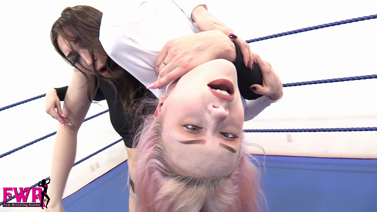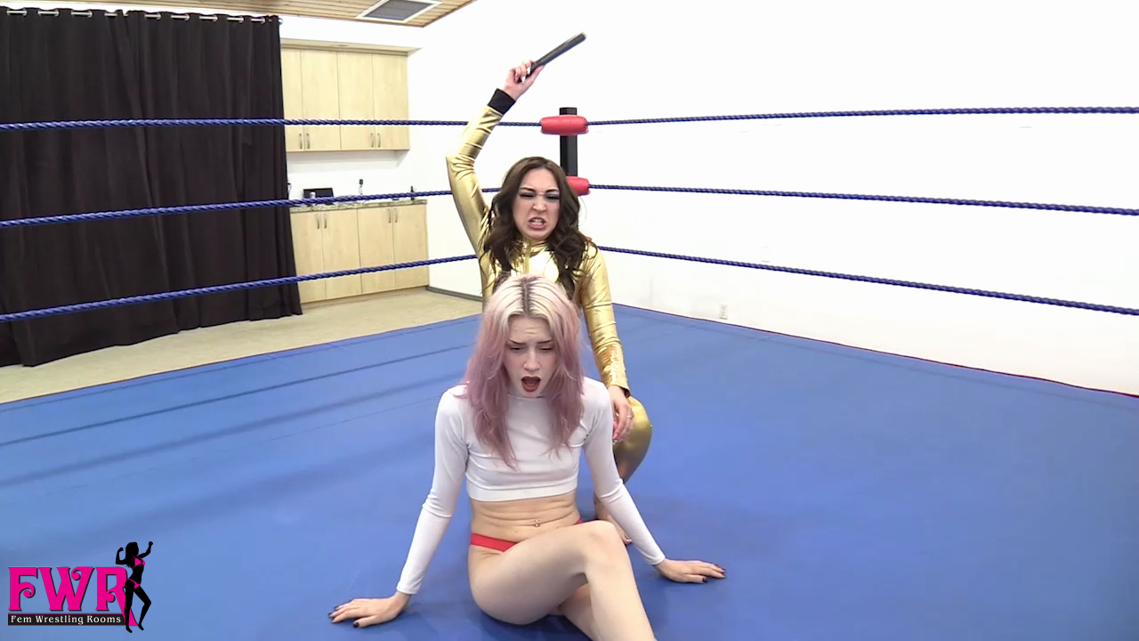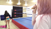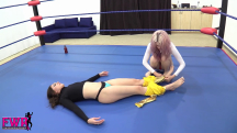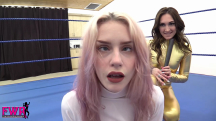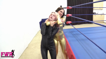 Stevie has become a double agent and Mackenzi is charged with capturing her and bringing her in for interrogation. Mackenzi hides in the dressing room and captures her adversary with a sleeper hold, then dragging her out to the wrestling ring. Before taking the cutie into headquarters, Mackenzi decides to have some fun. She strips Stevie out of her black cat suit and knocks her out with a black jack. Stevie’s eyes cross as she slips into unconsciousness. Mackenzi proceeds to use a stun gun on Stevie’s cute butt for the next KO. She calls her boss and make an excuse for why she won’t be bringing Stevie in right away but this give Stevie time to wake up and attack Mackenzi with a chloro rag! Stevie strips Mackenzi out of her catsuit and taps her nose to wake her up. She informs her adversary that she booby trapped the studio and if Mackenzi can escape, Stevie will turn herself in. A groggy Mackenzi crawls out of the ring and grabs the door handle only to be shocked by the electrified handle … cue jiggling, eye-crossing fun! There’s SO much action to describe that we simply don’t have enough space, but Mackenzi makes a comeback with some wrestling in the ring but in the end, Stevie is way too much for the sexy Latina to handle. The video is filled with over-the-top knockouts and tons of sexy taunting and trash talking. You MUST see this video!!